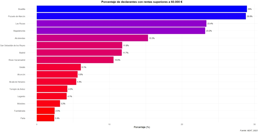 La AEAT ofrece la información desglosa para los municipios de mayor población. En el caso de los municipios madrileños, el 10,1 % de los declarantes de más de 60.000 € de Rivas se encuentra en valores medios. Tiene un porcentaje muy similar que el de la capital o de San Sebastián de los Reyes. En Parla y Fuenlabrada se encuentra la menor proporción de altas rentas (2,4 % y 2,5 % respectivamente). En cambio, en Boadilla y Pozuelo de Alarcón más de uno de cada cuatro declarantes declara una alta renta.
