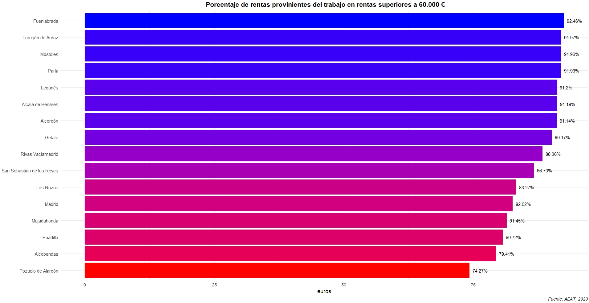 En Fuenlabrada, el 92,5 % de las rentas altas provienen del trabajo, frente a un 74,3 % de Pozuelo de Alarcón. En Rivas, el 88,4% de las altas rentas provienen del trabajo.