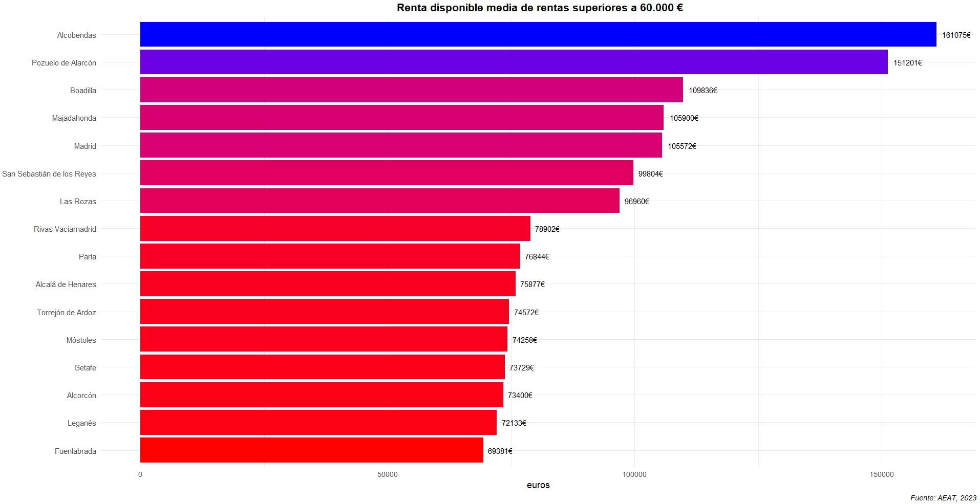 En cuanto a la renta media disponible de estas altas rentas, también Rivas se encuentra en valores medios respecto al resto de ciudades madrileñas. Los casi 79.000 € ripenses se encuentran menos de 10.000 € por encima del dato de Fuenlabrada, ciudad en las que las altas rentas declaran menor renta (pero siempre por encima de 60.000 €). En cambio, la máxima alta renta media, ubicada en Alcobendas, dobla la alta renta ripense.