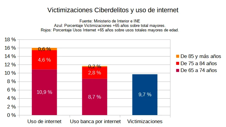 Sin embargo, podría suponerse que el peso poblacional de cada tramo de edad no debería de ser calculado sobre el total de la población sino sobre los usuarios de internet, dado que las personas mayores usan menos los servicios digitales. En este caso, nuevamente, las personas mayores de 65 años son víctimas de ciberdelitos en menor proporción que su peso entre los usuarios de internet. Las personas mayores de 65 años suponen el 16,1% de los usuarios de internet y el 11,7% de los usuarios de la banca por internet. Estos usos continúan por encima del 9,7 de ciberdelitos de los que son víctimas las personas de mayor edad.