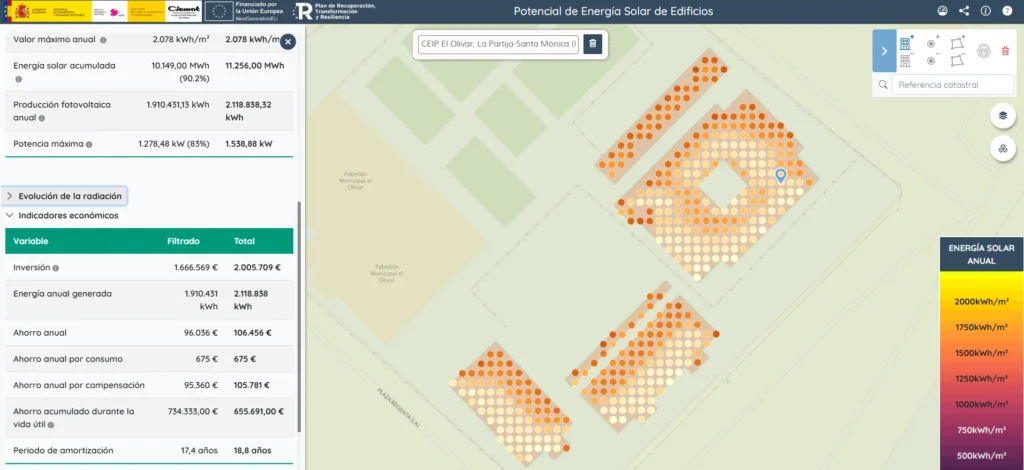 Ejemplo de visualización del potencial solar en el CEIP El Olivar, en el barrio de Covibar. La web ofrece tanto indicadores energéticos como económicos.