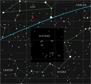 El Sextante es una constelación pequeña y débil que ocupa la parte sur del cielo, aunque se encuentra muy cerca de la línea ecuatorial. Rodeada por las constelaciones más visibles de Hydra, Leo y Cráter, fue introducida por el astrónomo polaco Johannes Hevelius en 1679, después de un pavoroso incendio en su observatorio, que sólo le dejó el sextante como instrumento de estudio. No posee estrellas notables, siendo las más importantes estas:
