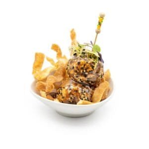 19 de mayo de 2022.- La historia de la tapa ganadora de la ruta gastronómica “Tapas de Series” comienza sobre una cama de patacón (plátano macho verde ) cubierta por una deliciosa ensalada de mariscos con cangrejo, gambas, aguacate , tomate , cebolla y cilantro.