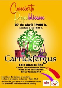 Además, el Ateneo ha planificado también un concierto republicano para el próximo 27 de abril que contará con la banda Carrickfergus. Habrá música en directo, barra y sorteos de artesanía. Las entradas se podrán adquirir una hora antes del concierto o en la propia fiesta republicana del 13 y 14 de abril por un donativo de cinco euros.