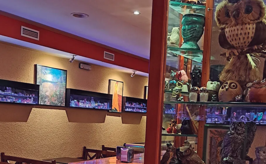 El Cárabo coge su nombre de “un ave parecida a un búho pero más pequeño y regordete”, explica Fernando, que abrió este “afterwork” antes de que dicho término se popularizase. Fernando, que abre a las 19:00 horas, sirve picoteos y comidas, y después copas hasta las 3 de la mañana entre diario y las 4 en fin de semana. Su colección de búhos es la prueba del amor por la naturaleza: el dueño del Cárabo ya mira de reojo cuándo podrá traspasar el local y dedicarse a dar paseos. “No quiero más pasta, quiero ir a dónde me lleve un club de montaña con un bocata de tortilla, para mí eso es la gloria”, dice.