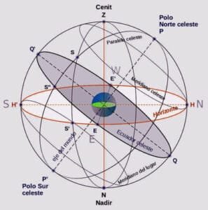 Para situarnos en el cielo, utilizamos la proyección del globo terrestre sobre la oscuridad que nos rodea, a la que llamamos cielo o firmamento. Dicha proyección forma un gran círculo cuyo centro pasa por el centro de la Tierra y es perpendicular al eje de rotación de la misma. Como resultado de la inclinación que presenta el eje de rotación de la Tierra, el ecuador celeste tiene una inclinación de ~23.5° con respecto al plano de la órbita de la Tierra, llamado eclíptica, por cuya línea circulan los todos los planetas del Sistema solar y el Sol mismo. Los dos puntos de la esfera celeste en los que se corta la eclíptica con el ecuador celeste son denominados equinoccios, que corresponden a los puntos de primavera y de otoño, donde la noche tiene igual duración que el día.