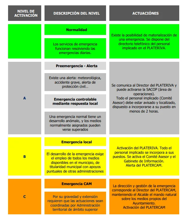Al activarse este nivel, todo el personal implicado debe incorporarse a su puesto de trabajo. Este nivel puede requerir de apoyos puntuales de otras administraciones, pero principalmente se lleva a cabo con recursos municipales. La alarma, en este nivel, se dirige a la población afectada.