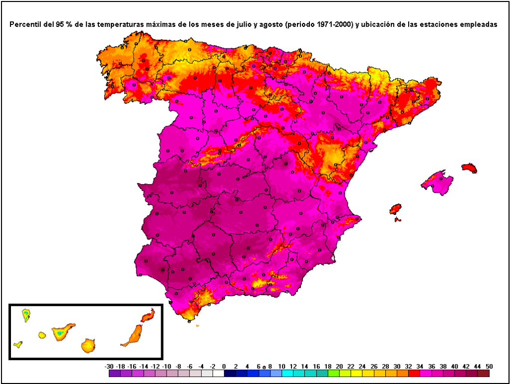 El siguiente mapa muestra el umbral de temperaturas máximas en España que se deben superar durante al menos tres días seguidos en al menos el 10% de las 137 estaciones meteorológicas seleccionadas por tener una serie histórica suficientemente larga y distribuidas uniformemente sobre el territorio.