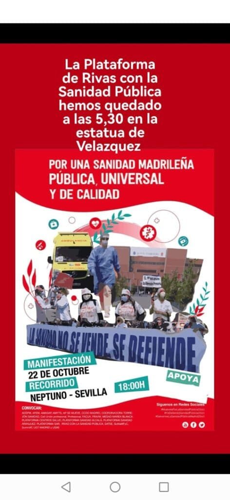 La Plataforma de Rivas con la Sanidad Pública ha sacado un comunicado para la manifestación del sábado en Madrid: