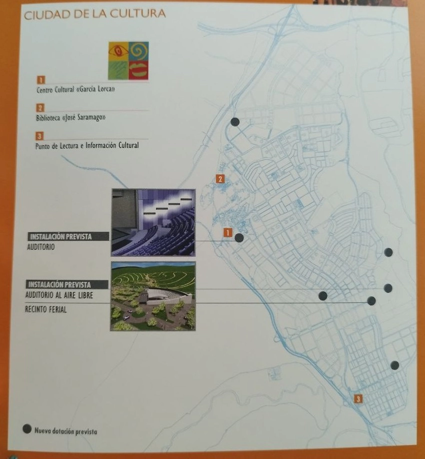 En 2002, solo existían el centro cultural Federico García Lorca, la biblioteca José Saramago y el punto de lectura del Casco (hoy, Biblioteca Almudena Grandes). El plan preveía los auditorios Pilar Bardem y Miguel Ríos, ya en funcionamiento, y otros cuatro espacios, como la actual biblioteca Gloria Fuertes o parcelas aún vacías.