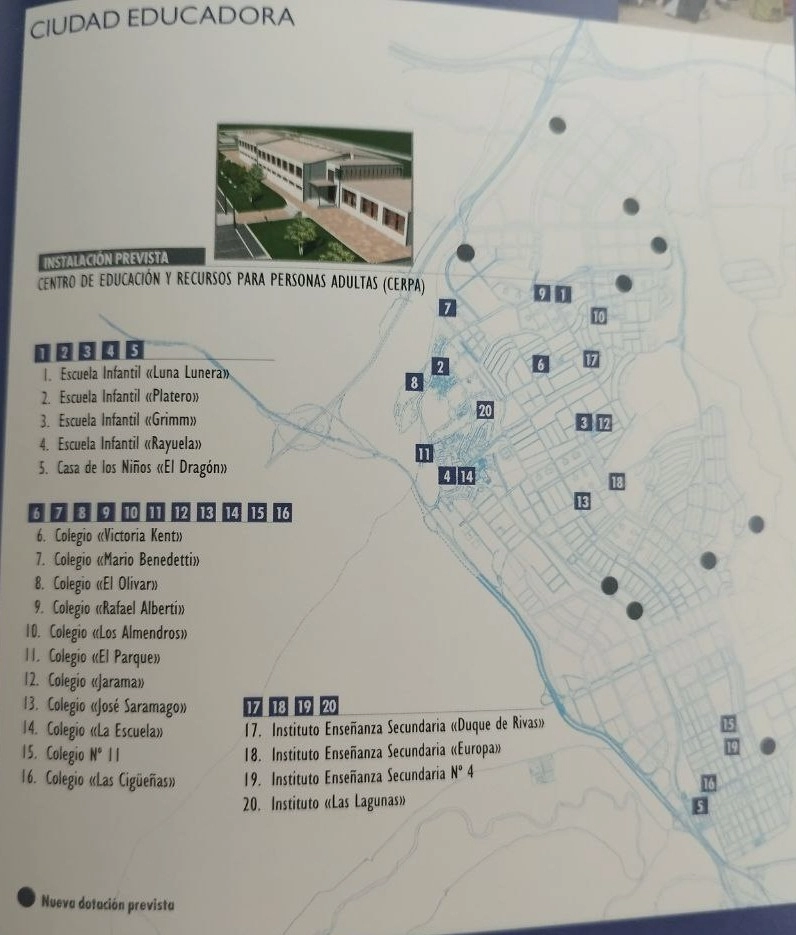 En 2002 había 11 colegios de primaria; hoy hay 16. El instituto Julio Pérez se denominaba entonces IES nº 4. También se preveía el actual CERPA. Algunos suelos indicados en los mapas siguen sin uso concreto, pero el avance educativo ha sido evidente.