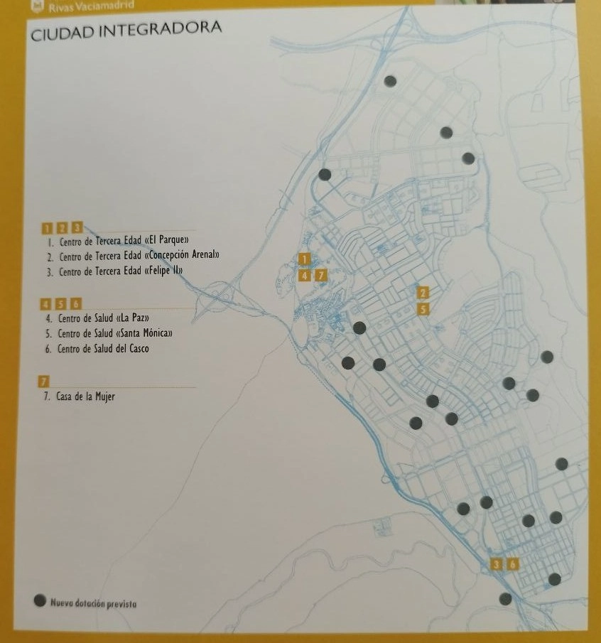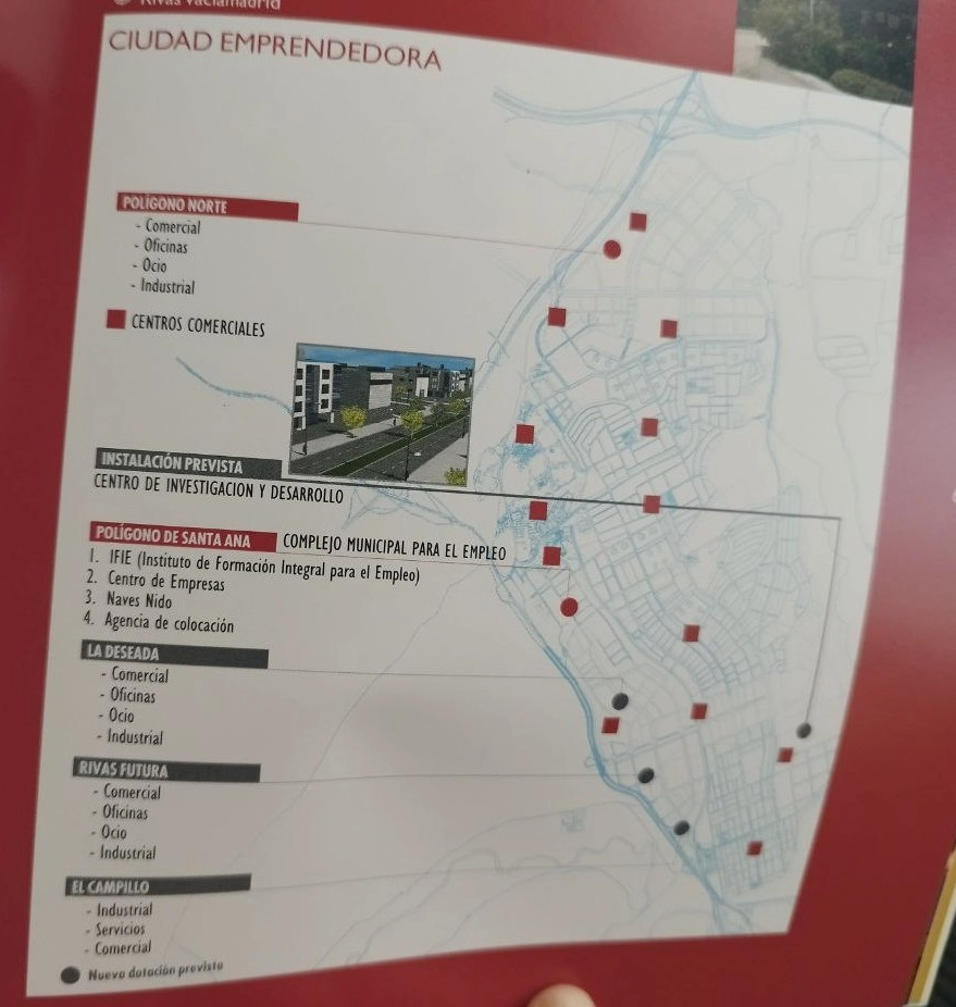 El folleto hablaba de 13 centros comerciales de distintos tipos y tamaños, un instituto de empleo (hoy Marcelino Camacho), la agencia de colocación y un nuevo polígono industrial. Algunos espacios, como las zonas comerciales de Santa Ana y Rivas Futura, se han desarrollado. Otros, como el “Polígono Norte”, no se han ejecutado. El futuro PGOU prevé cambiar de ubicación y usos esta zona industrial.