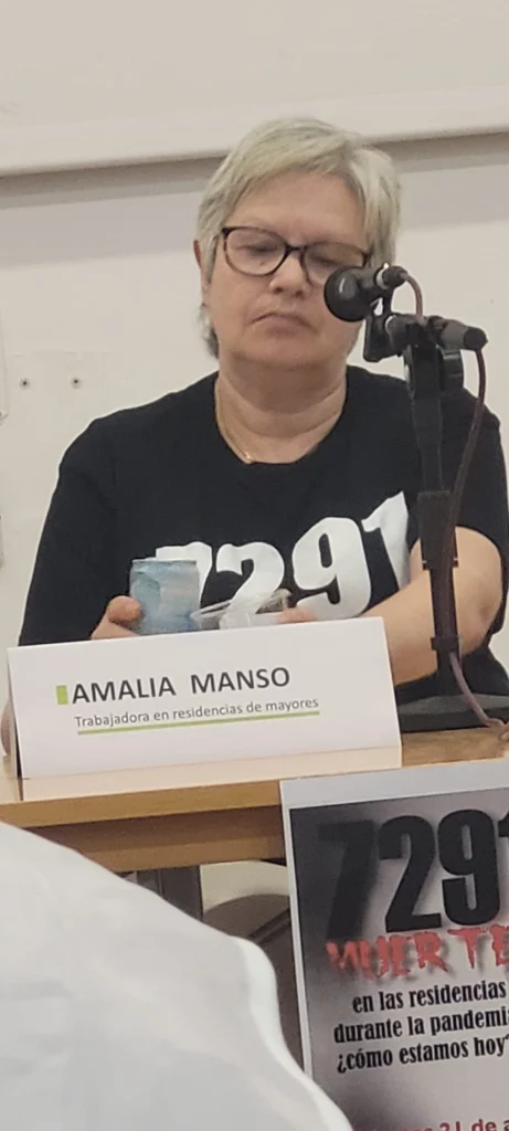 Por último, Amalia Manso, trabajadora en residencias, ha relatado el día a día en una residencia de mayores, en las que a estas personas se les priva de autonomía, seguridad y se les suprime de su derecho a decidir. ”¿Quién haría eso con sus padres en su casa? Estáis pagando 2.800 € para que se les haga eso”, denuncia con rabia dirigiéndose al público. También denuncia la falta de materiales sanitarios, como respiradores o medicamentos, para que las personas mayores pudieran fallecer con dignidad durante la pandemia. La culpa, dice, “fue de los malditos protocolos”.