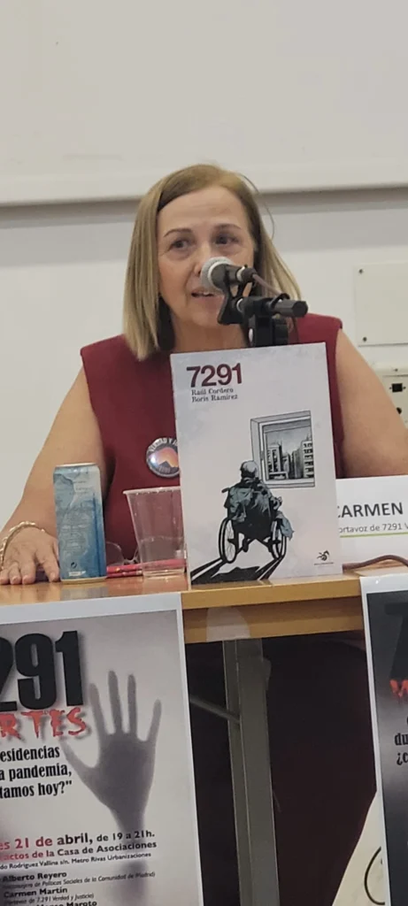 A continuación ha intervenido la portavoz de 7.291 Verdad y Justicia, Carmen Martín. “Antes del COVID las residencias ya estaban en un estado lamentable”, ha comenzado denunciando. La institucionalización del cuidado en residencias, considera Martín, implica una “pérdida de derechos”, al no poder comportarse una persona mayor como lo haría en su casa al verse, por ejemplo, obligado a seguir horario o rutinas. Hoy, denuncia la portavoz, las trabajadoras se siguen encontrando en situación de precariedad laboral y se han producido recortes. “Estamos en una situación igual o peor que antes de la denuncia”. Además, explica que hay residencias en las que se continúa prohibiendo a las familias el acceso a las instalaciones en las que conviven sus familiares.