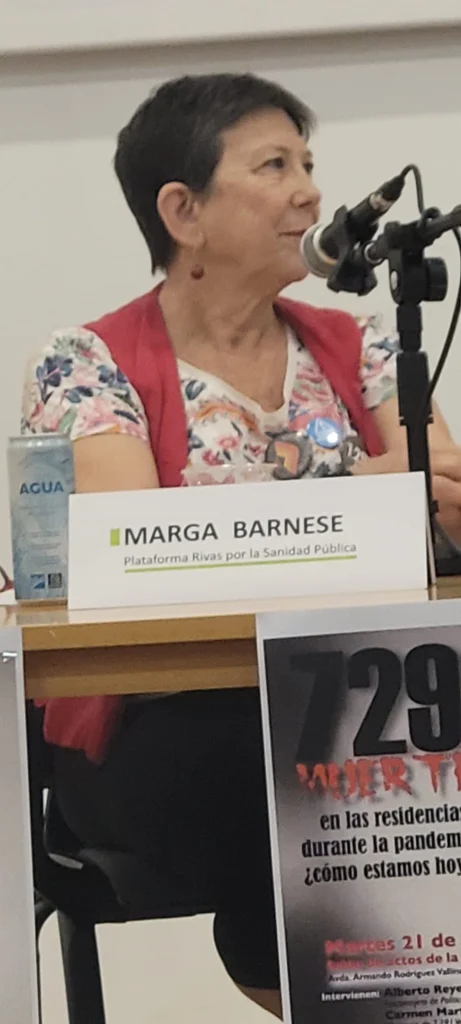 El acto ha comenzado con la presentación de Margarita Barnese, de la Plataforma Rivas con la Sanidad. Barnese ha recordado que el número de 7.291 fallecimientos en las residencias públicas madrileños en los primeros momentos de la pandemia COVID (2020) se trata del número que dió originalmente la propia Comunidad de Madrid. En esta lucha por investigar lo sucedido “todas y todos nos sentimos parte”, ha reivindicado Barnese.