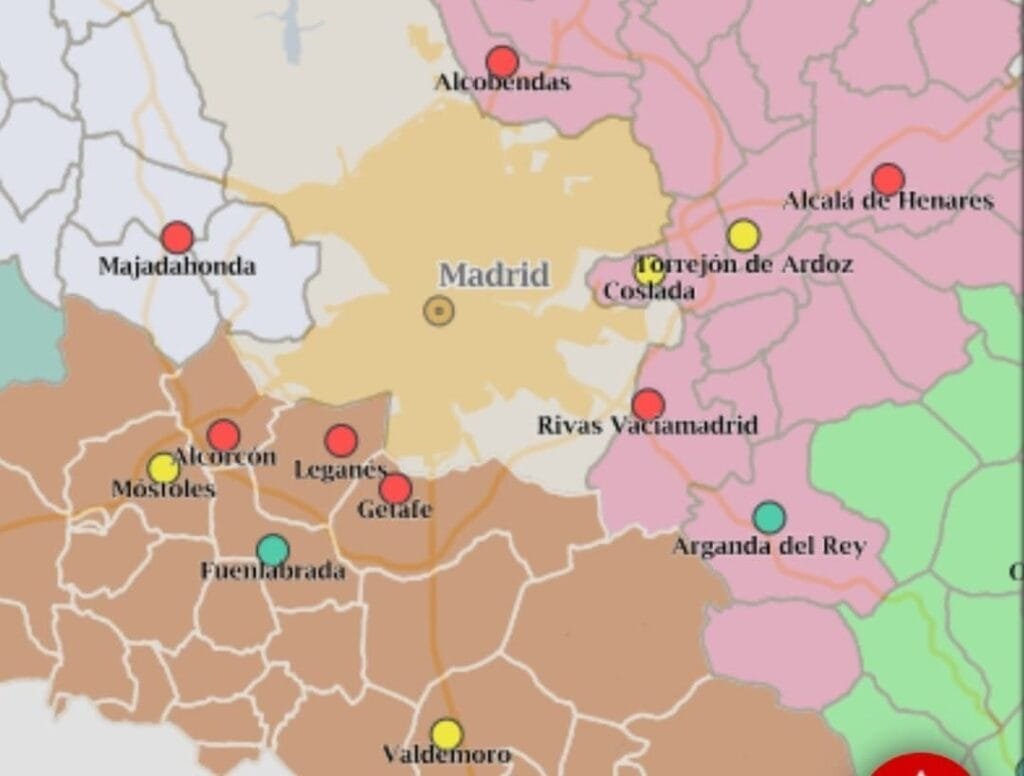 El mapa muestra cómo es ahora mismo la situación en las poblaciones de la @ComunidadMadrid más próximas a la capital. Todas las poblaciones de la primera corona metropolitana a excepción de Coslada, registran niveles de CO₂ por encima de 120 μg/m³. Aunque Coslada está en 119 μg/m³.