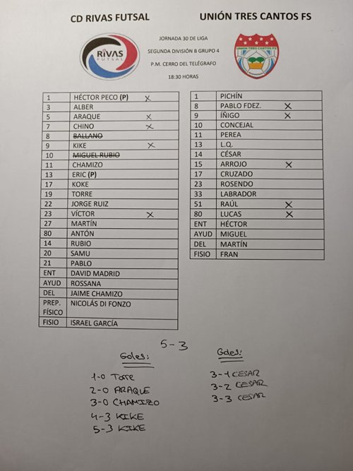 Ficha técnica: Rivas Futsal 5-3 Unión Tres Cantos Sábado 07/07/22 18:30 horas Cerro del Telégrafo: 400 espectadores Árbitros: José Luis Alonso / Miguel Ángel López Goles: 1-0 Torre 8’ 2-0 Diego Araque 13’ 3-0 Chamizo 18’ 3-1 César 20’ 3-2 César 26’ 3-3 César 27’ 4-3 Kike 31’ 5-3 Kike 39